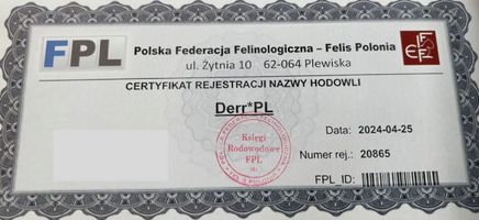 Nasz hodowla deRR należy do Polskiej Federacji Felinologicznej „Felis Polonia” (FPL)która jest największą w naszym kraju organizacją zrzeszającą Kluby i Stowarzyszenia Felinologiczne, a także jedynym w Polsce członkiem największej na świecie Międzynarodowej Federacji Felinologicznej – Federation Internationale Feline (FIFe). „Felis Polonia”, pod względem wielkości i aktywności, zajmuje trzecie miejsce w rankingu wszystkich krajów członkowskich FIFe.